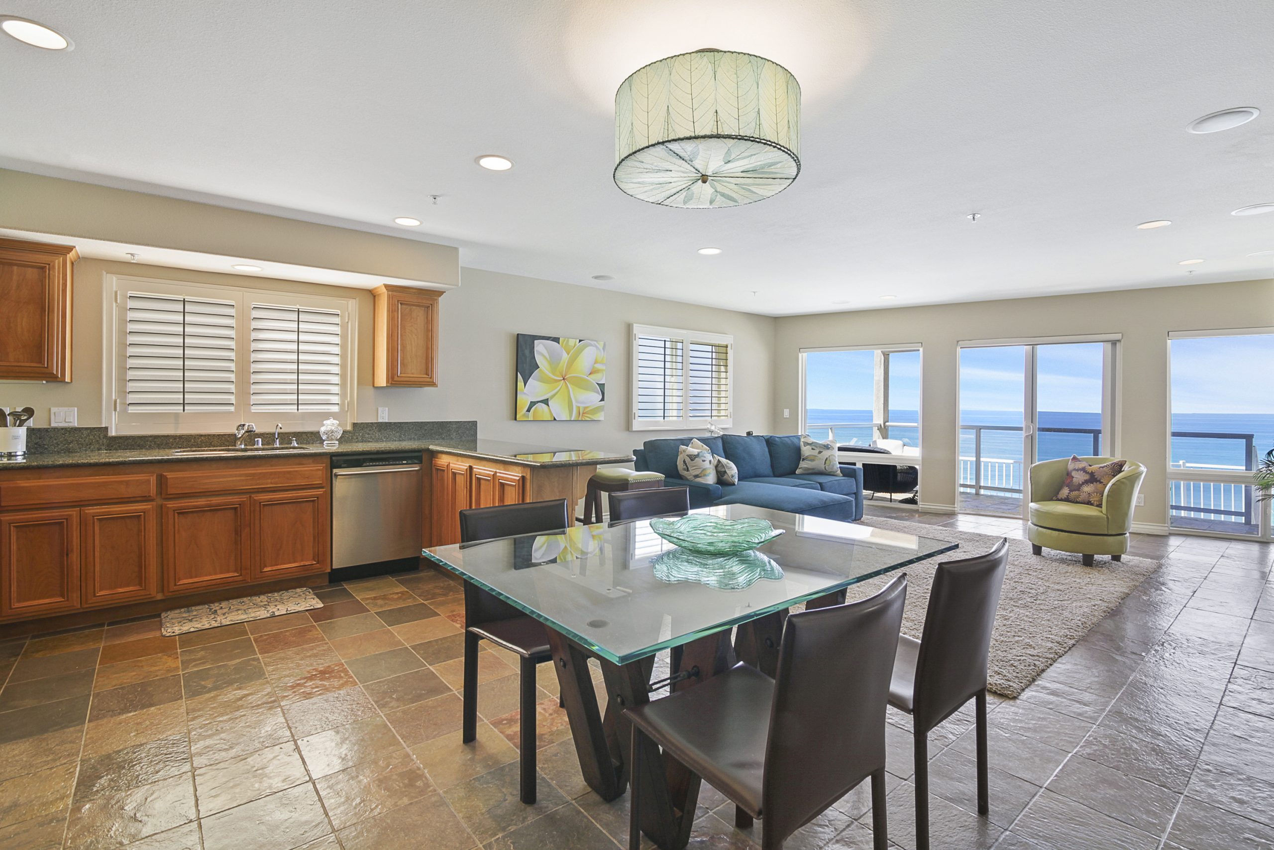 All this opens to the dining area and family room where one can see breathtaking views of the Pacific Ocean, pier, surfers, train, bluff, and walking trails. Or on a cold winter night turn on the fireplace and watch the sunset with its magnificent array of colors. A sliding glass door from the family room accesses a balcony extending the full length of the unit showcasing the same amazing views near the BBQ.