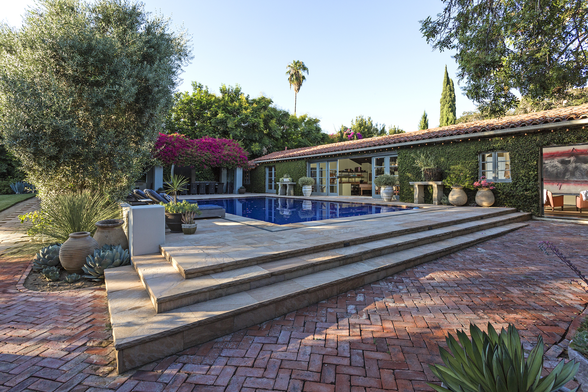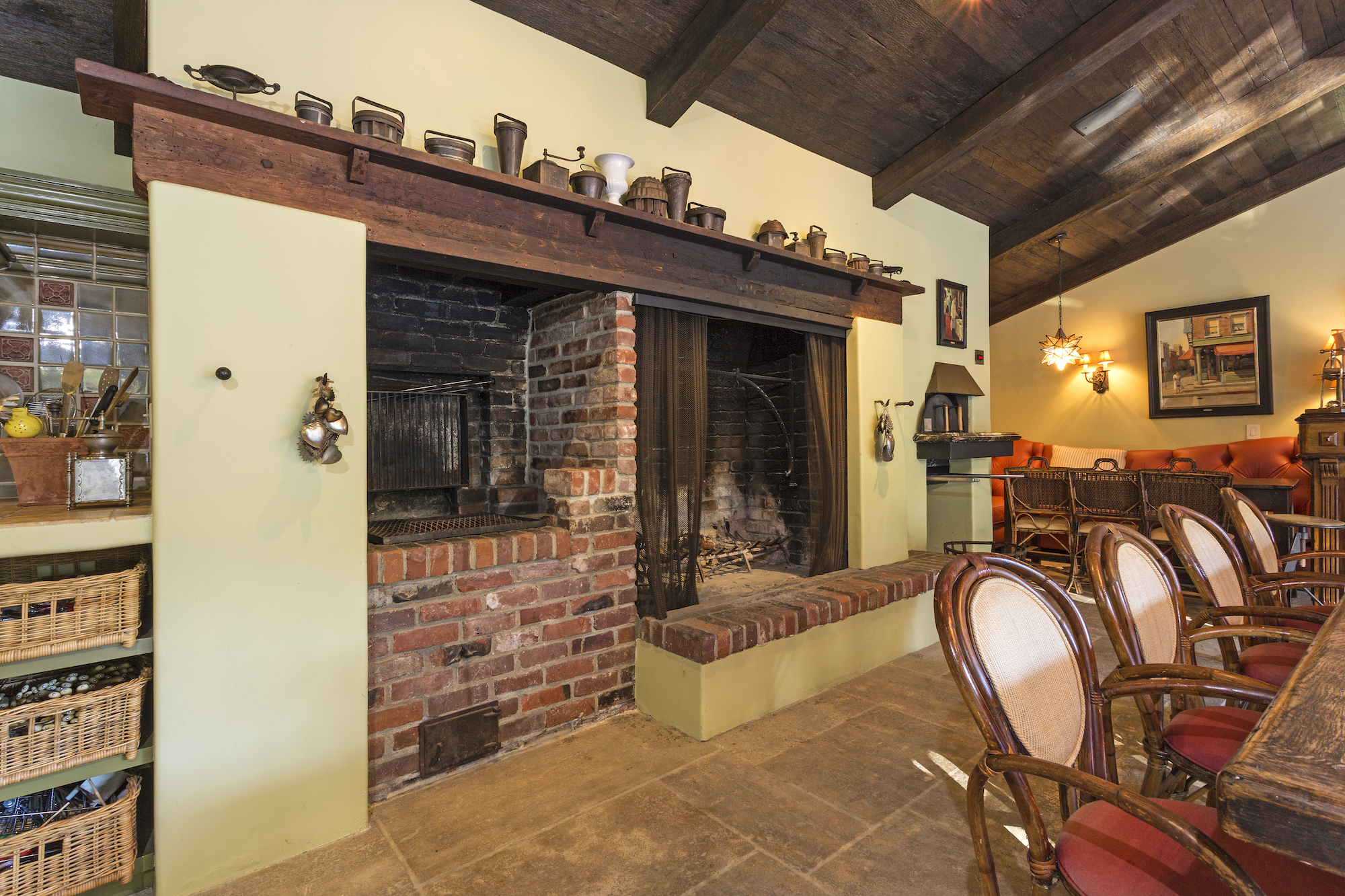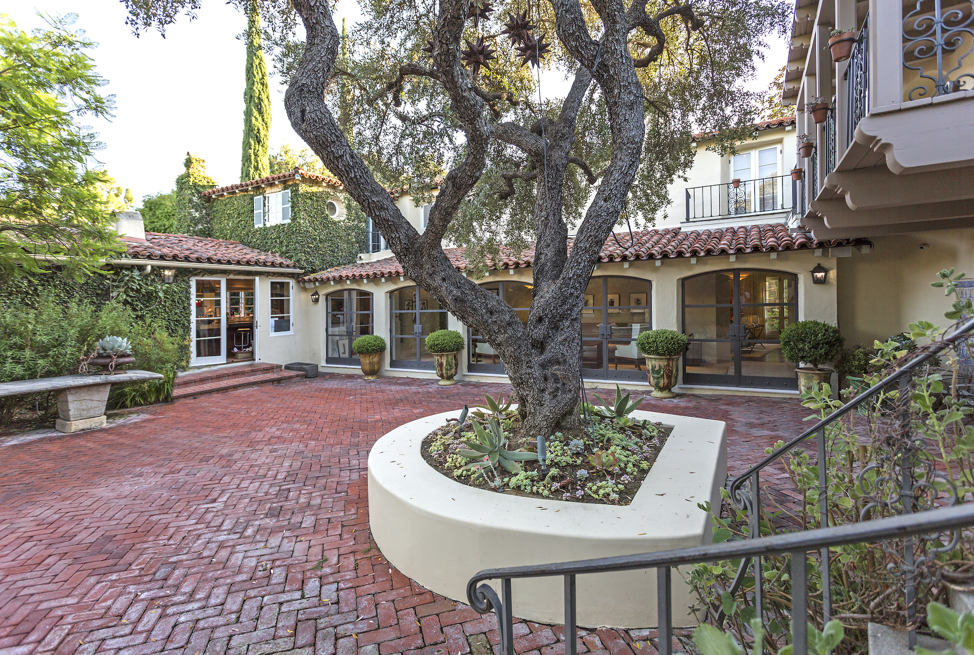 A central brick courtyard with fountain and original Portuguese tile leads from the main house to the side and rear lawns.