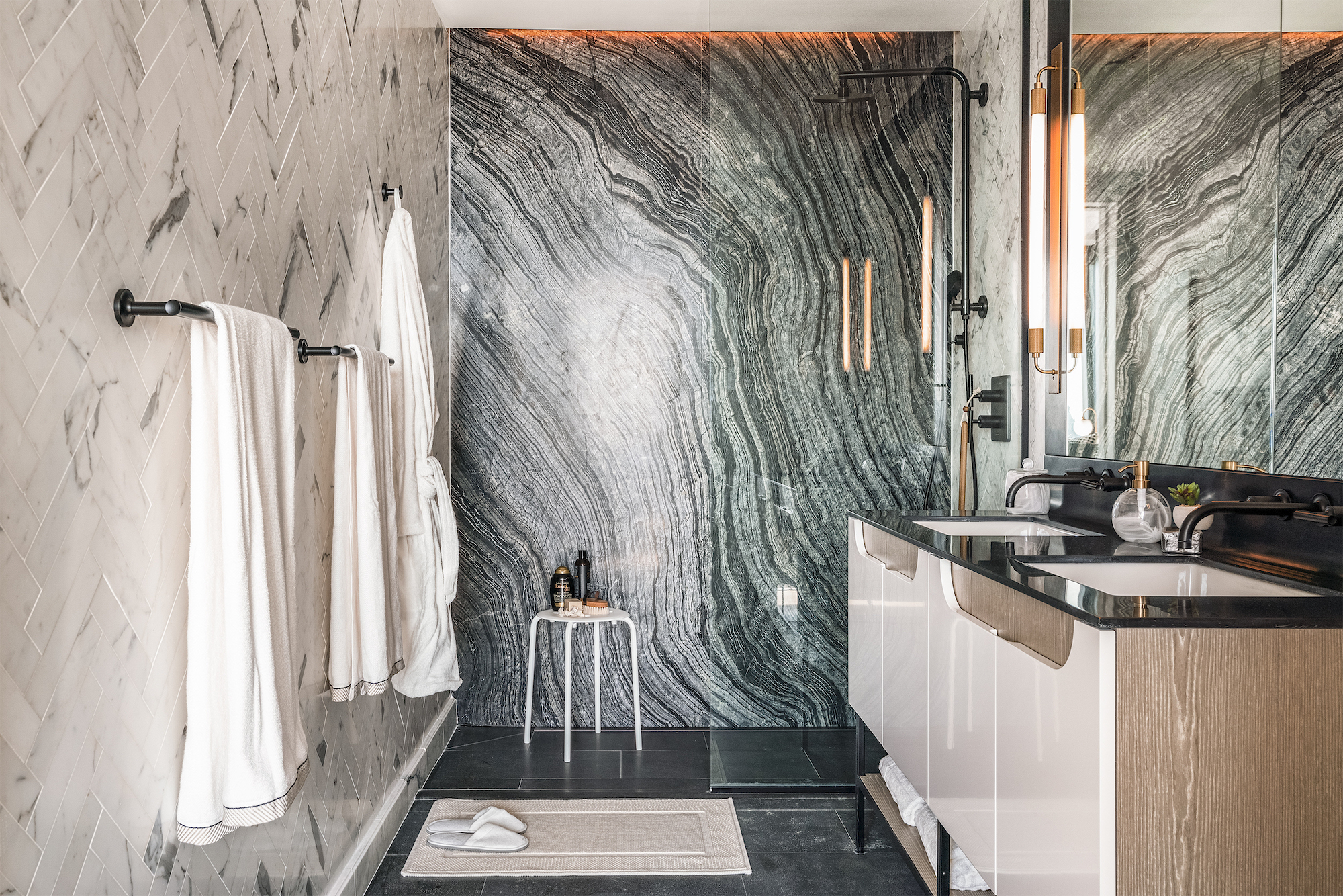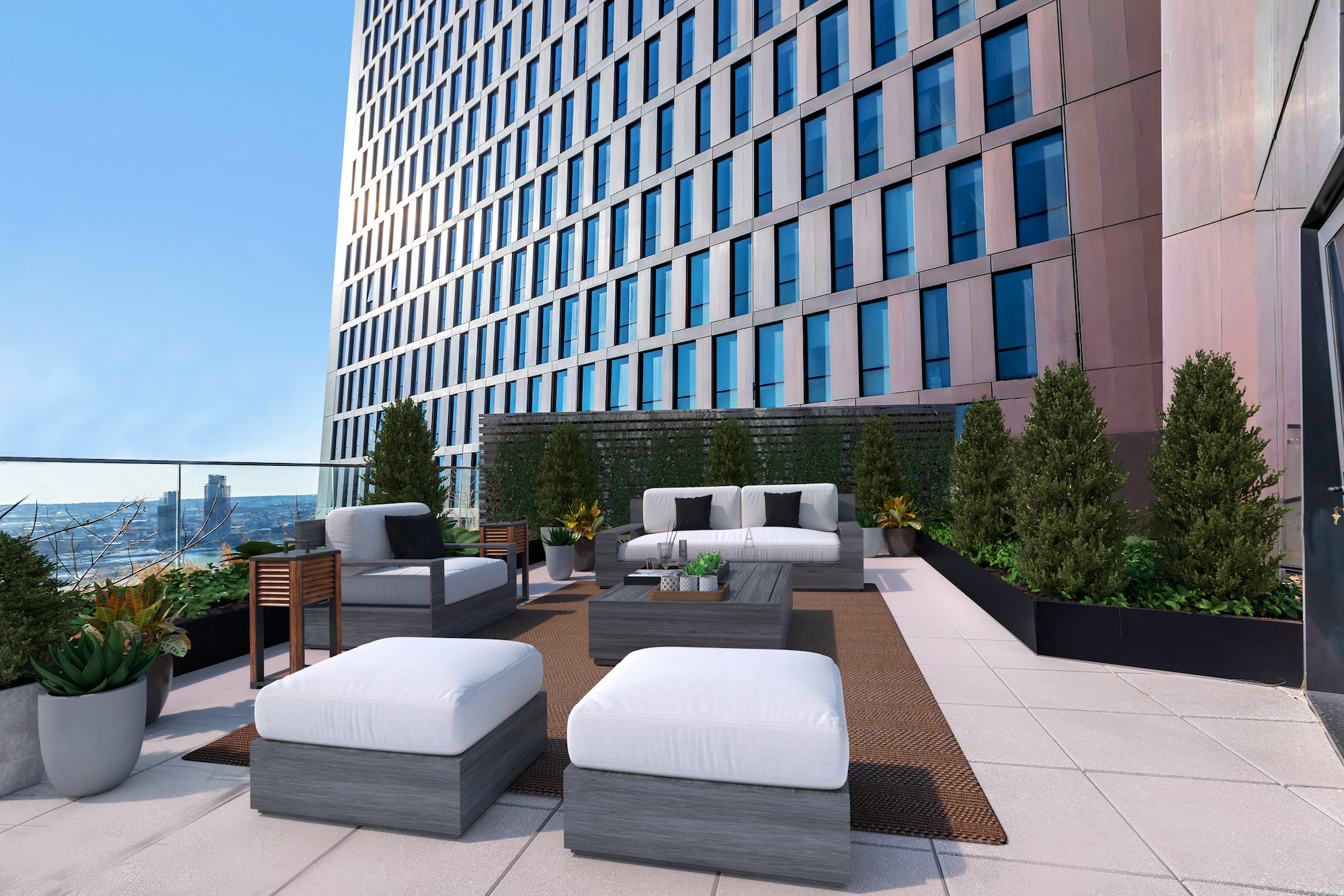 The buildings have approximately 60,000 square feet of amenities, including two swimming pools (rooftop infinity and 75′ indoor Skybridge lap pool), a dual floor fitness center (including climbing wall, studio, Peloton bikes and more) juice bar, entertaining kitchen, a lounge for private events, children’s playroom, and electric car charging stations.