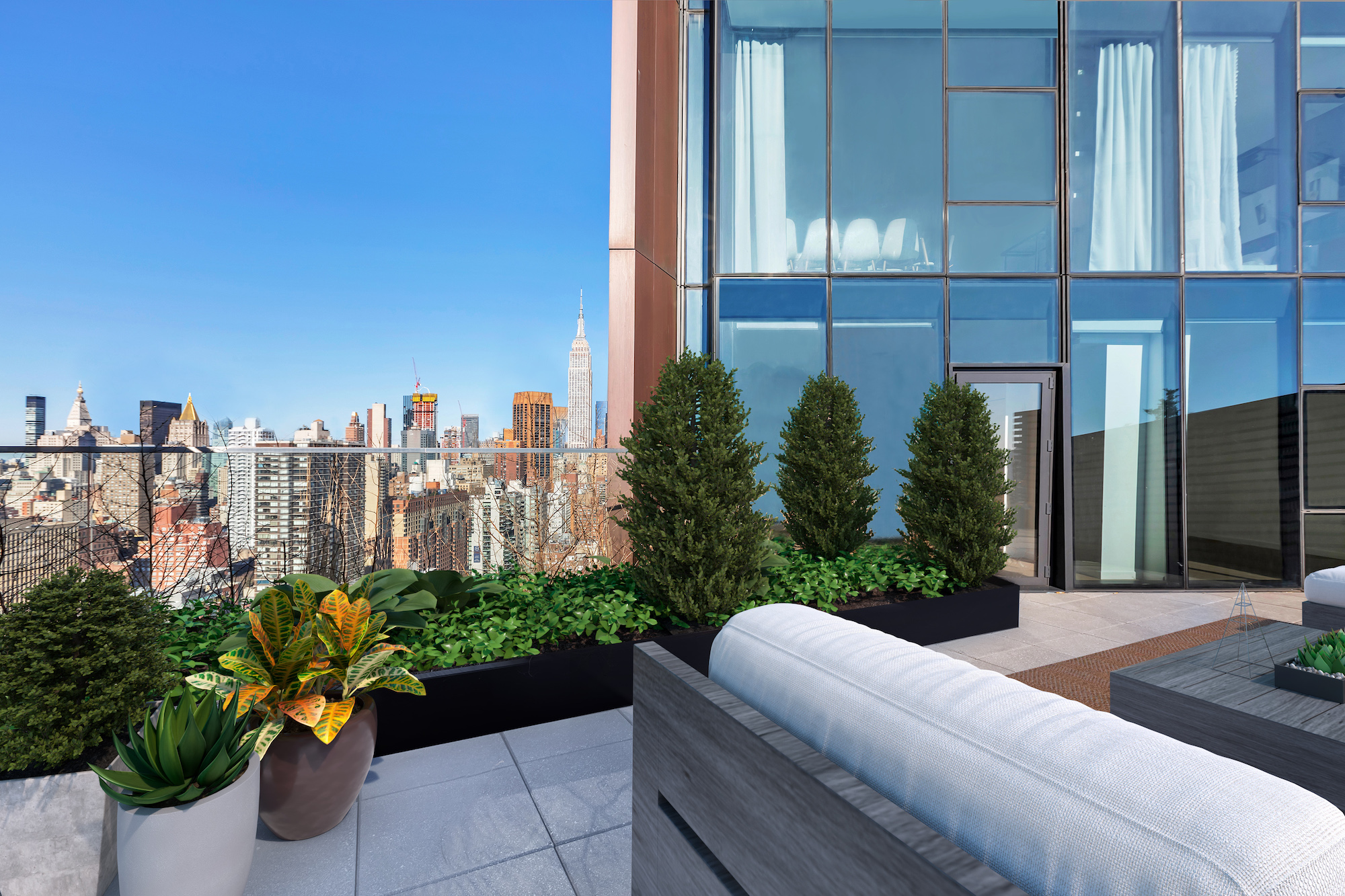 The high-floor corner two-bedroom, two-bath features panoramic river and midtown views with South and East exposures showcased through the floor-to-ceiling glass windows. Ideal for entertaining, the home has a custom kitchen by SHoP Architects with statuary marble countertops and backsplash. The units have custom solar shades and wood floors along with smart home technology including Nest and key fob entry.