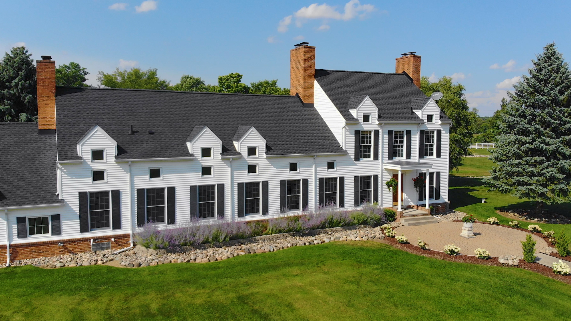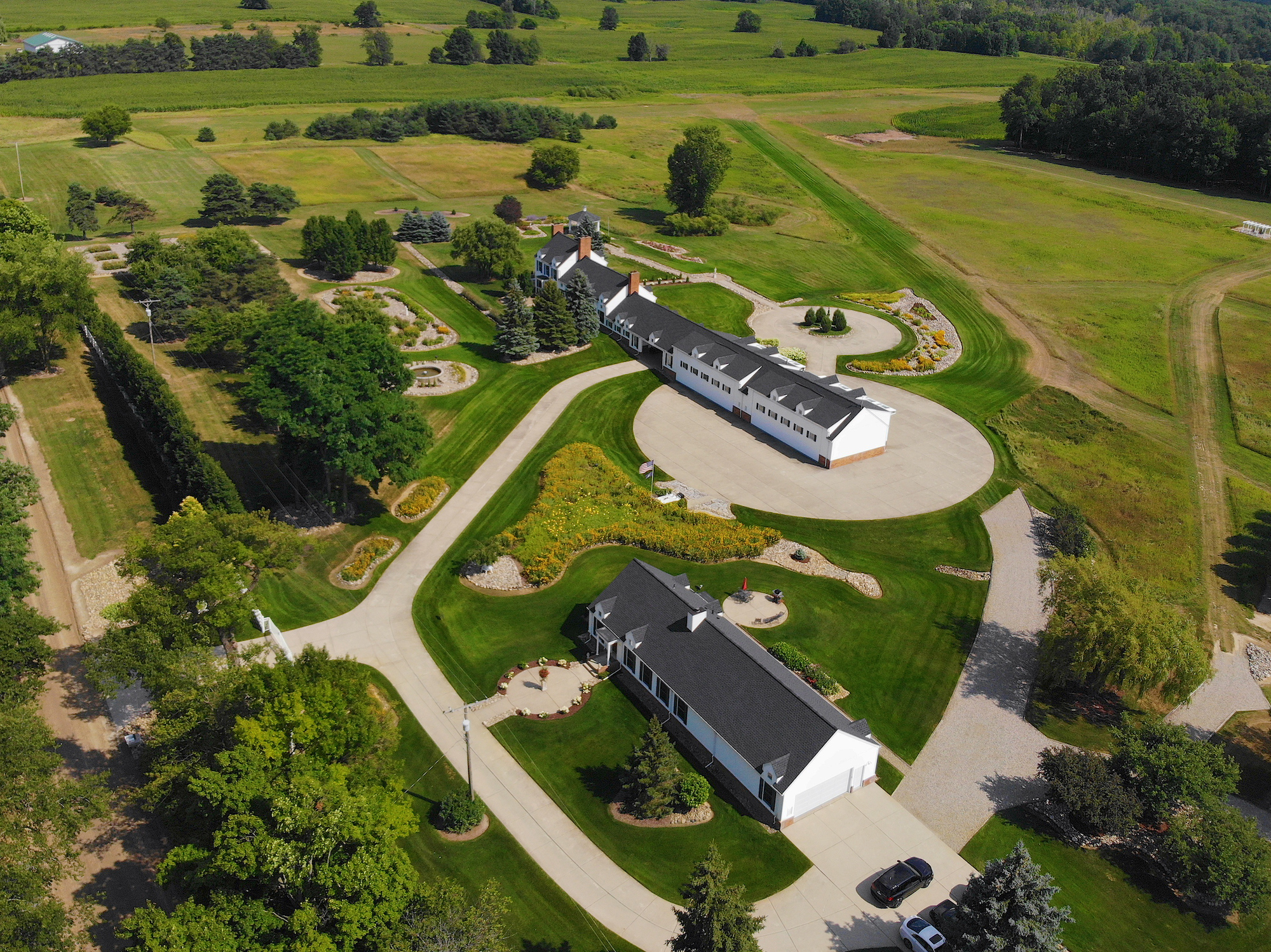 In addition to the 4,789 sq.-ft Neumann Smith-designed home, the property is exquisitely-maintained with magnificent flower gardens, wildflower fields, and orchards as well as a 35-acre woods.
