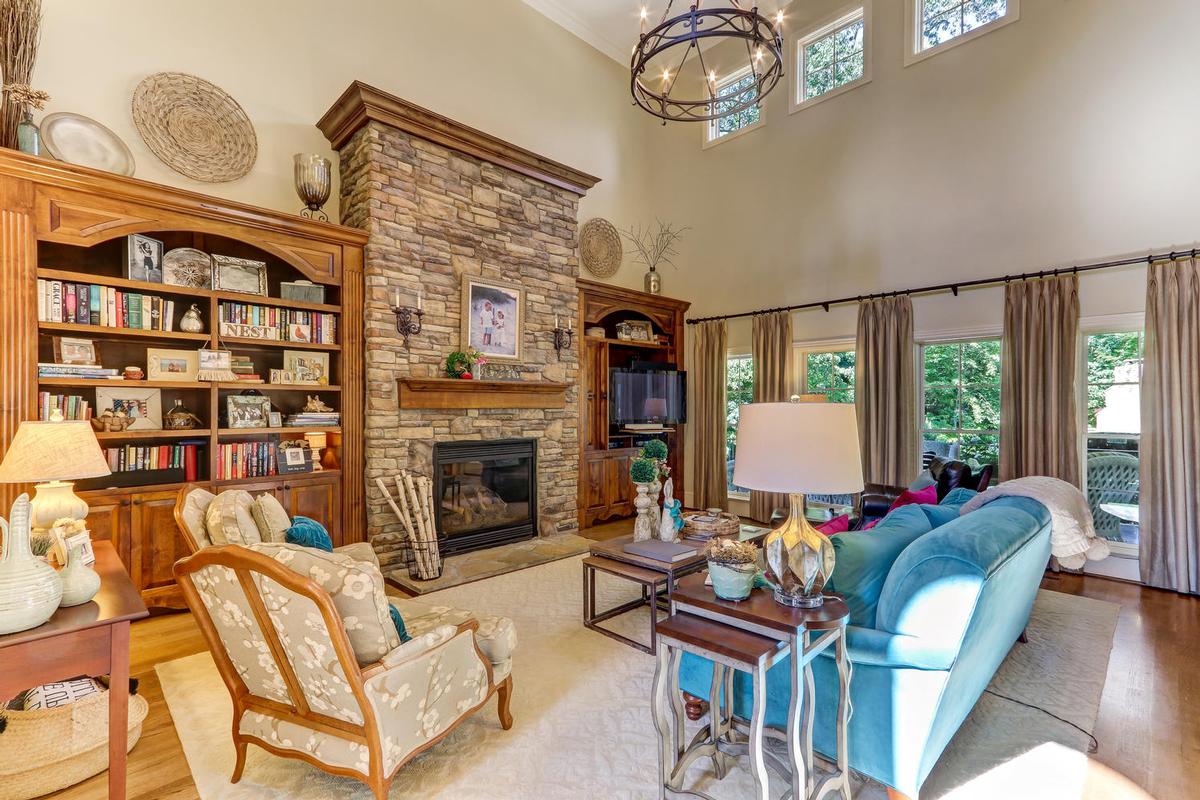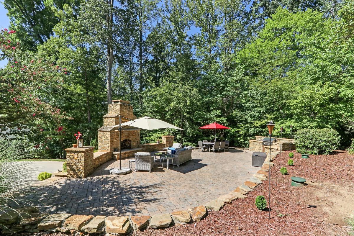 The backyard includes a fireplace and patio. This home is listed for $839,999 with Allen Tate Company, an affiliate of Luxury Portfolio International®.