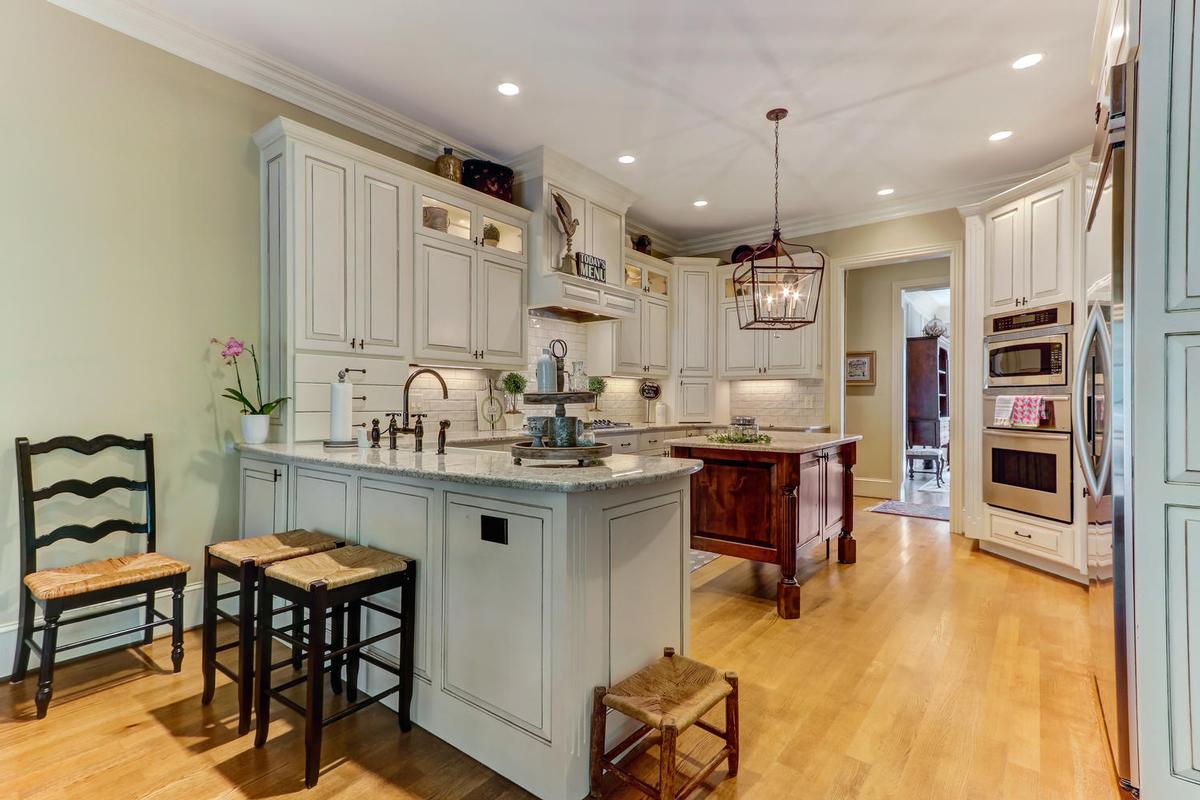 The remodeled kitchen features a farmhouse sink, granite, island and sliding barn door entry.