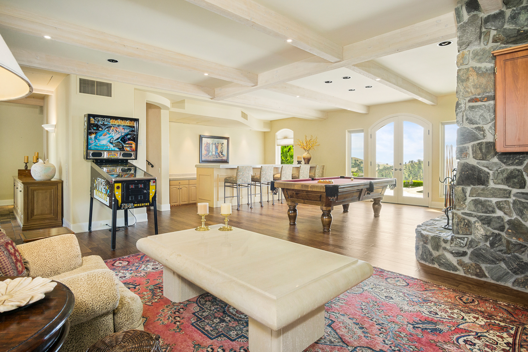 There is an entertainment and game room with a full bar through the grand entrance foyer that leads out to the walk-up pool, large backyard water feature and complete outdoor barbecue.