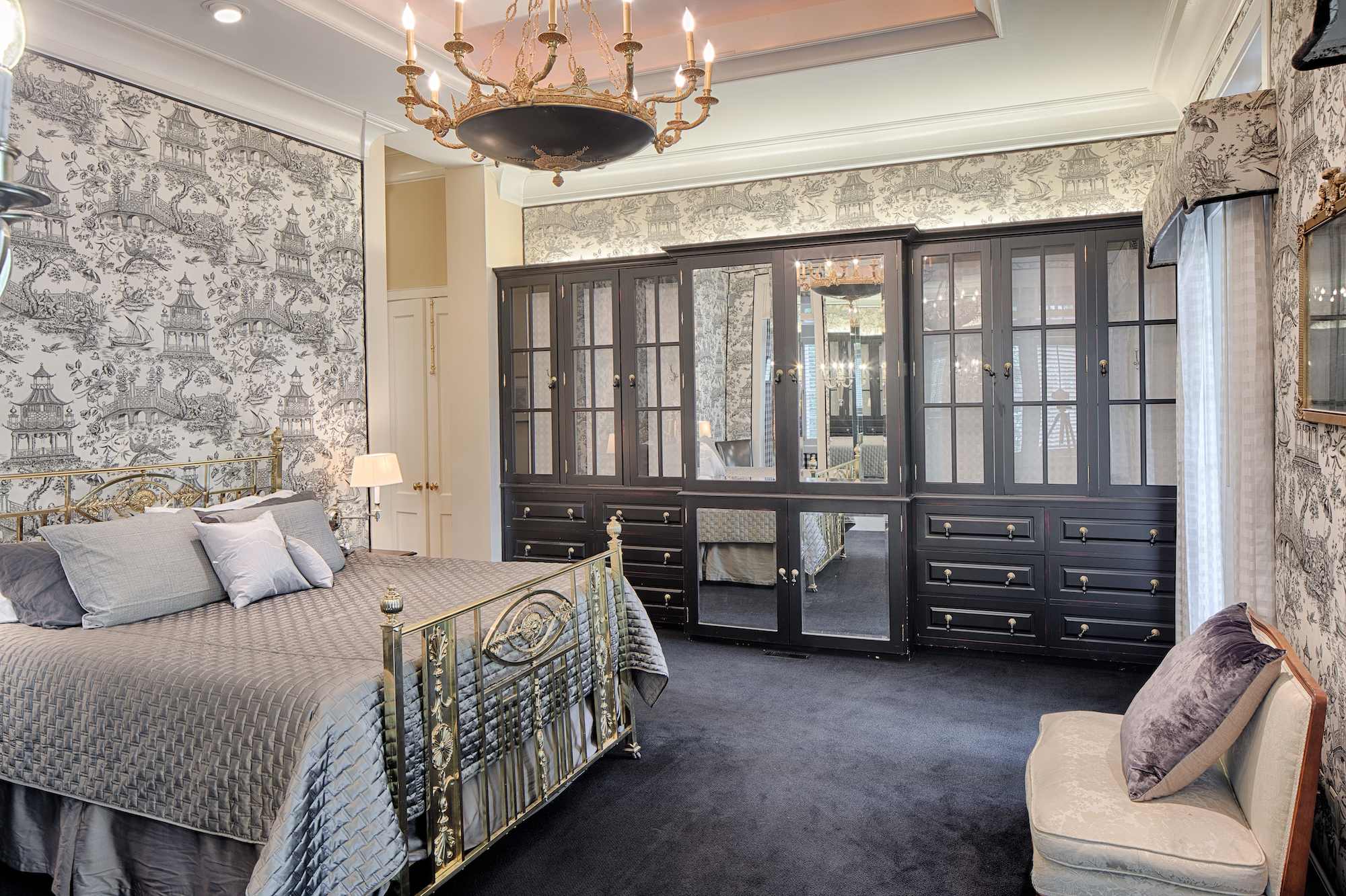 The master suite on the main floor boasts a private study, custom-built cabinetry, his and hers walk-in closets, and a master bath with an oversized Carrara marble shower.