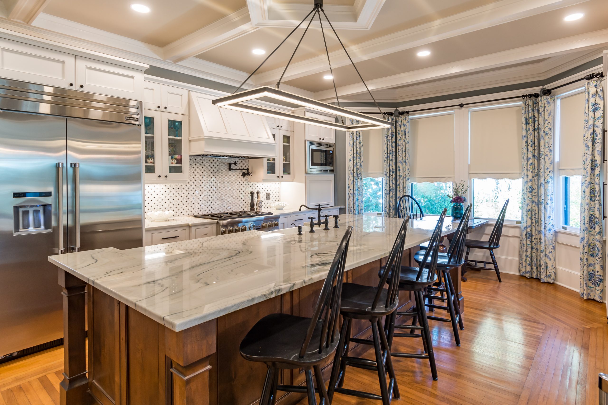 The kitchen features custom inset cabinetry, Thermador appliances, and tile mosaic backsplash.