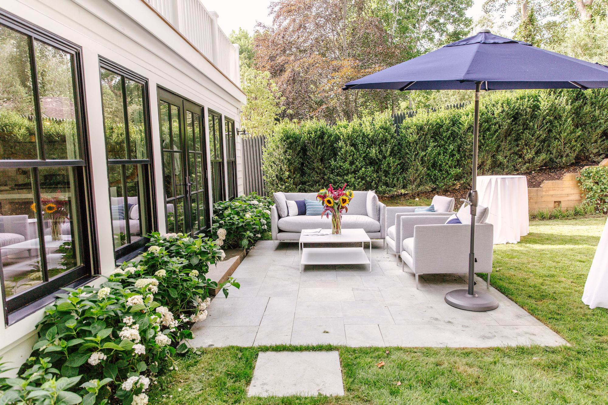 French doors transition seamlessly the inside to the outside and the private back yard with bluestone patio, barbecue, living and dining spaces and a cottage garden with boxwood, hydrangeas and euonymus.