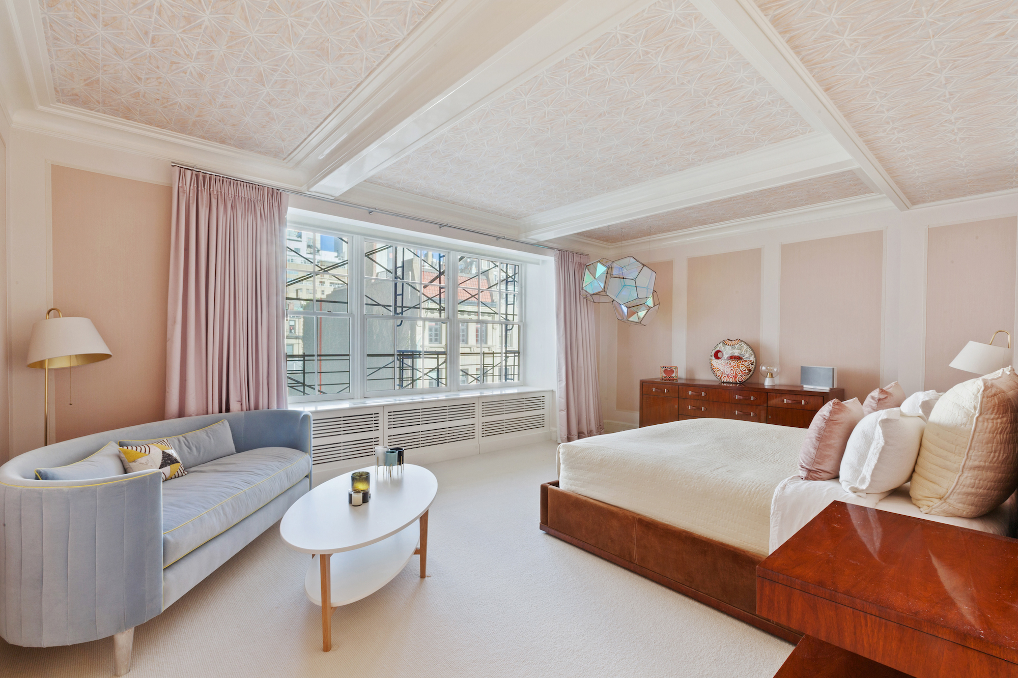 The four-bedroom residence was designed to combine historic charm with stylish modern updates. The semi-private elevator opens to an elegant foyer, shared by one other apartment- providing additional privacy and solitude. The expansive layout features a double living room with architectural detail like coffered ceilings and oversized windows that frame sun- filled North and West corner views of the Metropolitan Museum of Art. Flawless Mahogany wood floors pave the hallways and the reception rooms.