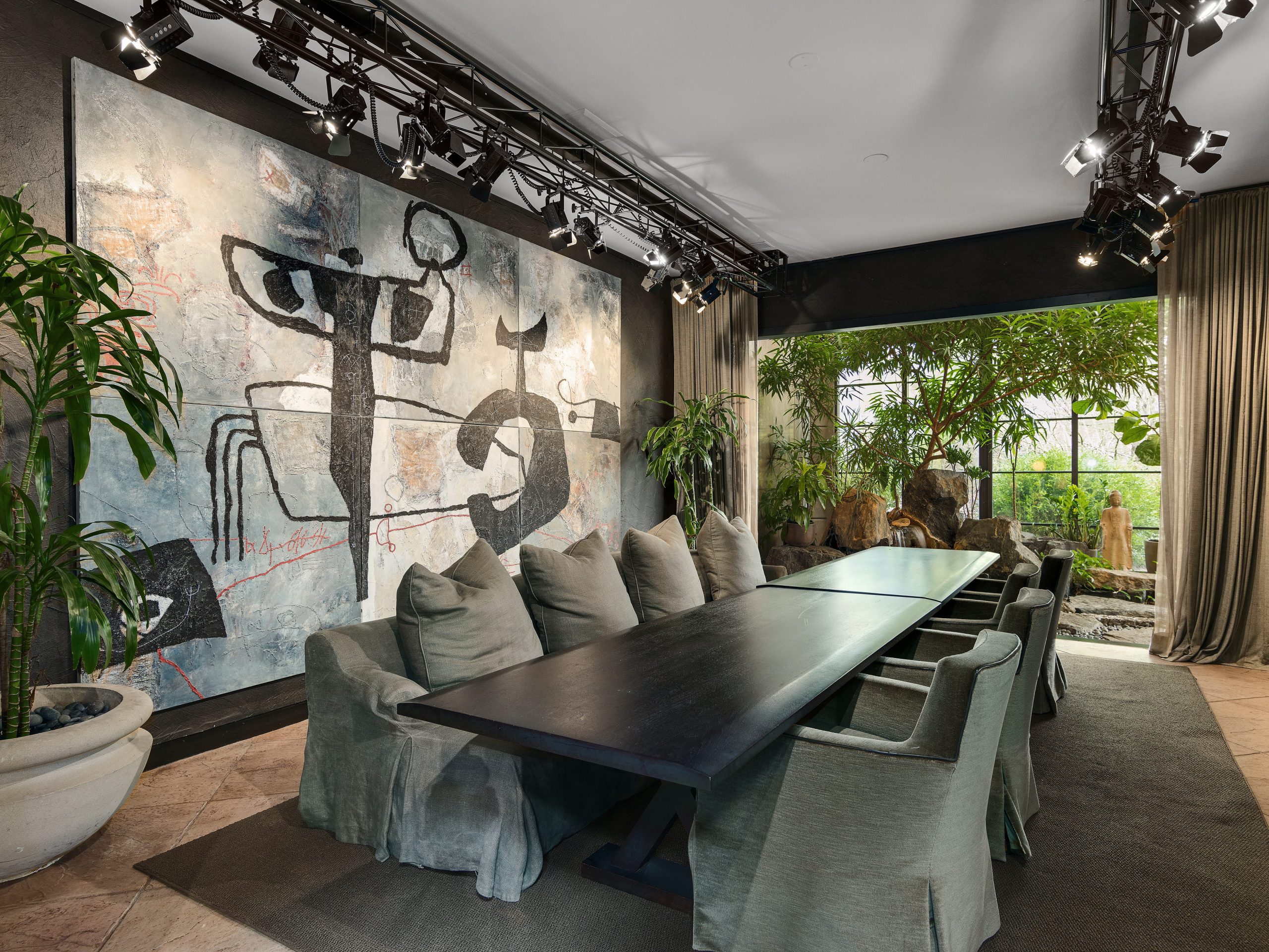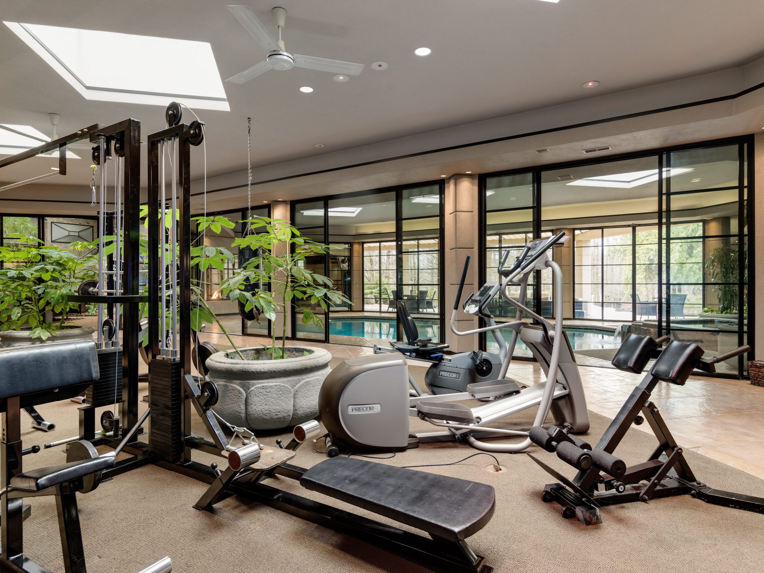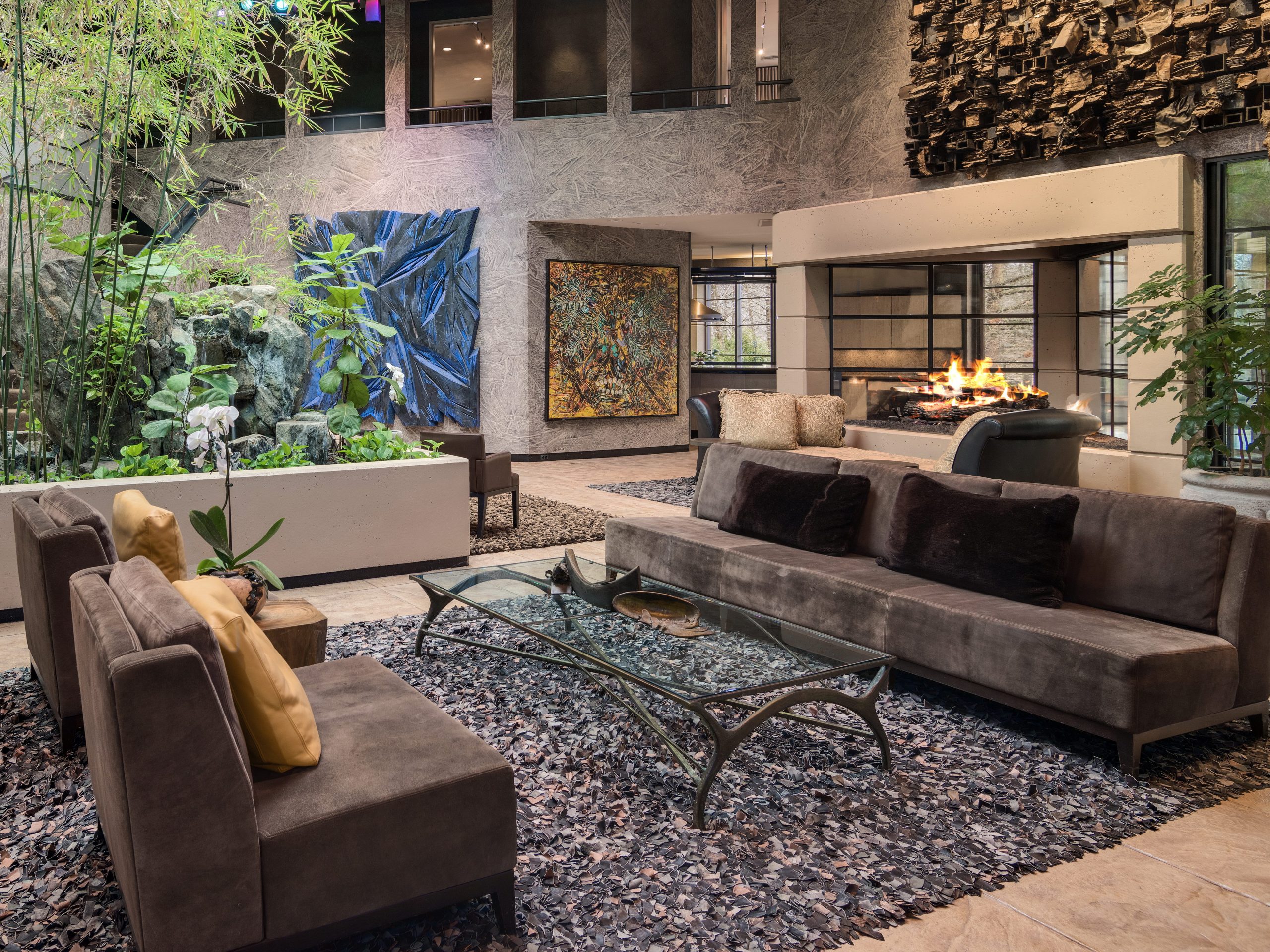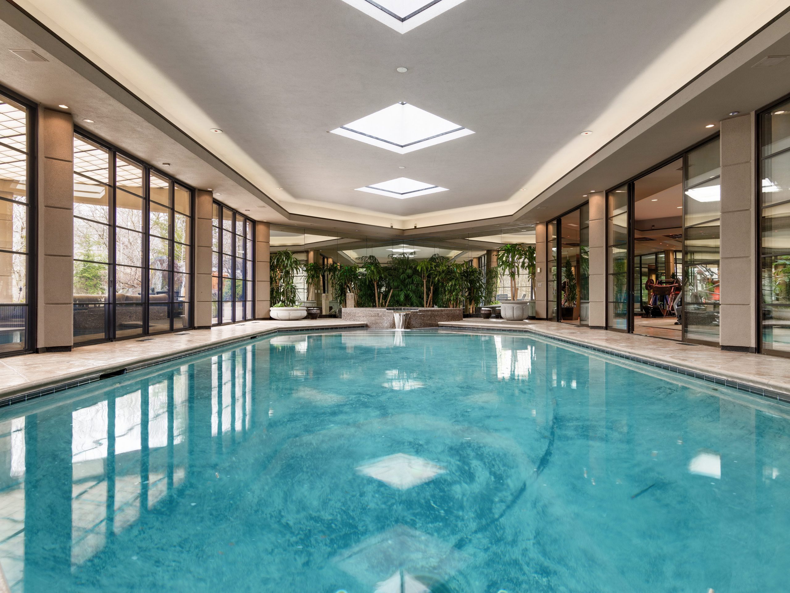 Sliding double doors lead to the great room, which is centered around a waterfall, lush trees, and two fireplaces. The spa includes a lounge, dry & steam sauna, soaking tub and wet bar.
