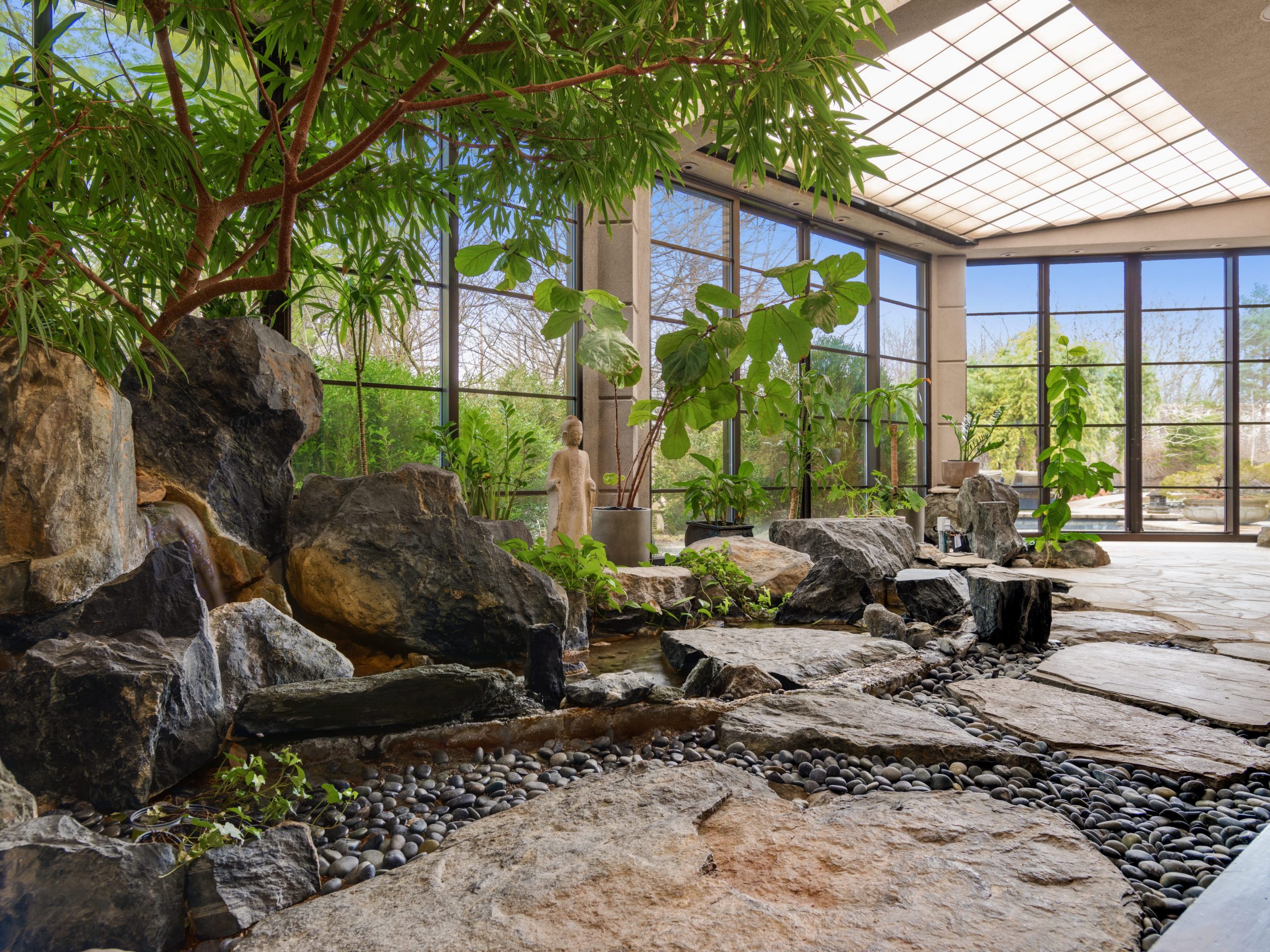 A half-mile private drive through thousands of trees brings you to a dramatic, Japanese-inspired gated entry with circular drive. The property boasts a five-acre Japanese-inspired garden, which was designed by award-winning Japanese garden designer Hoichi Kurisu. Features include exotic tree species, large granite boulders, a mile of manicured paths, bridges, and trails. Other exterior amenities include a tennis court, meditation deck, an outdoor pool with waterfall and several ponds, all overlooking 26 acres of pristine wetlands.
