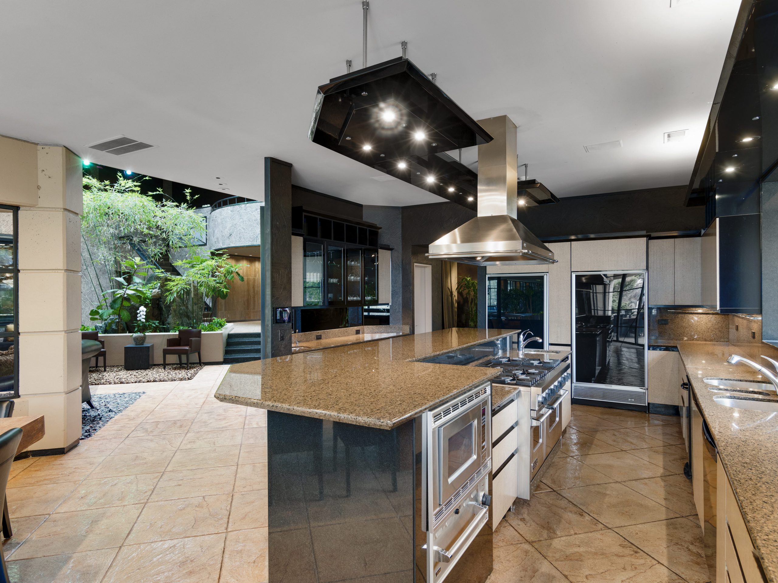 The open kitchen features Sub-Zero and Viking appliances an opens to a dining area overlooking the pool.