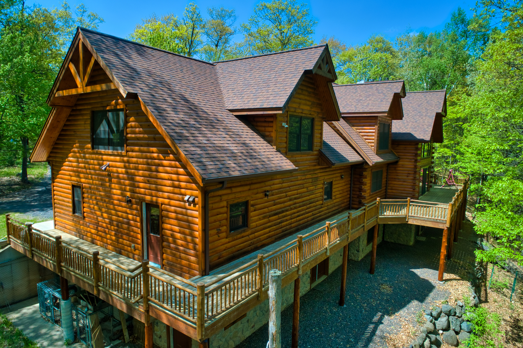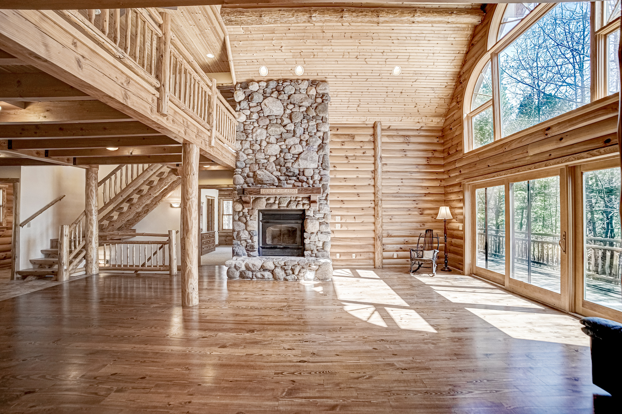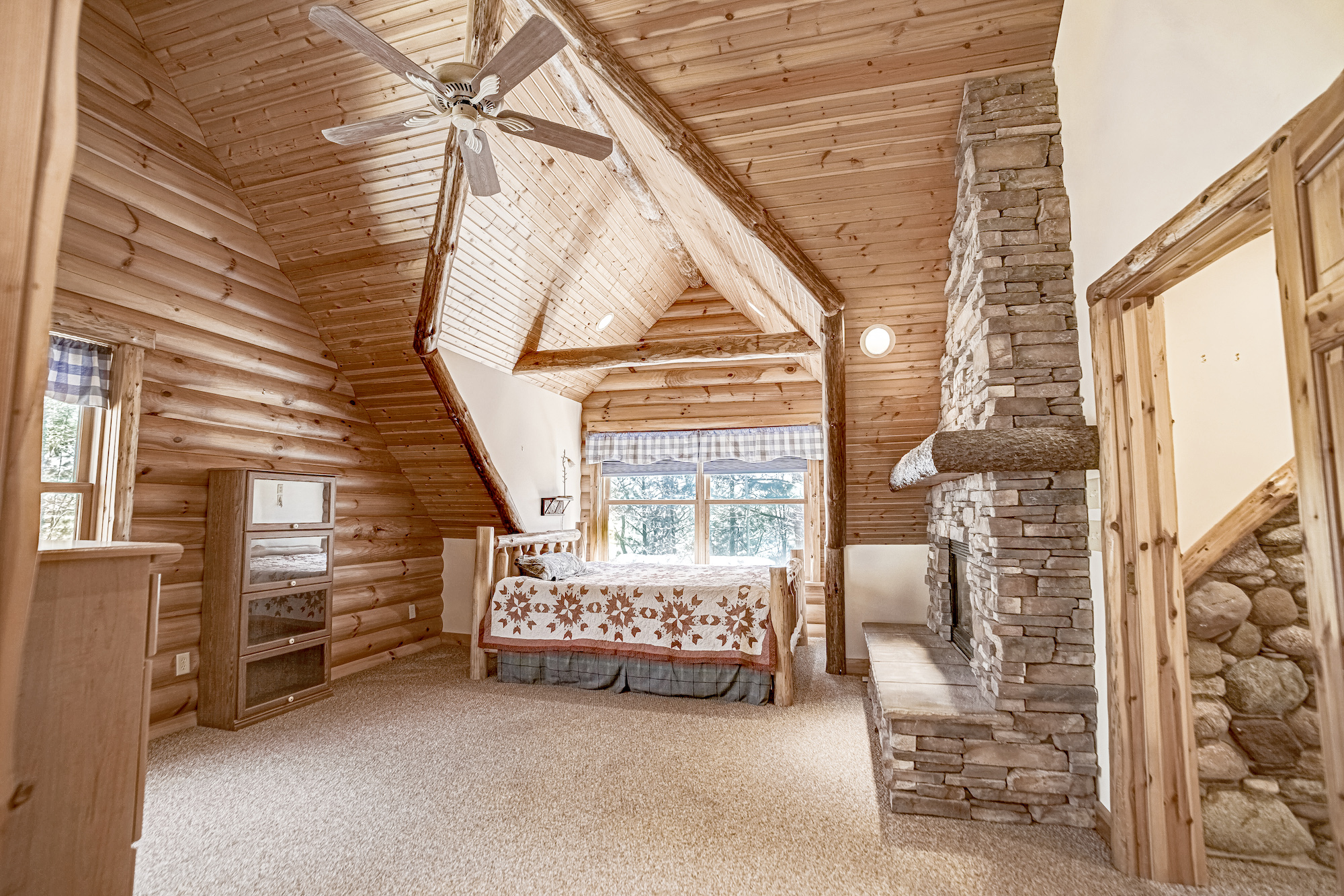 There are two master suites with large windows and stone fireplaces.
