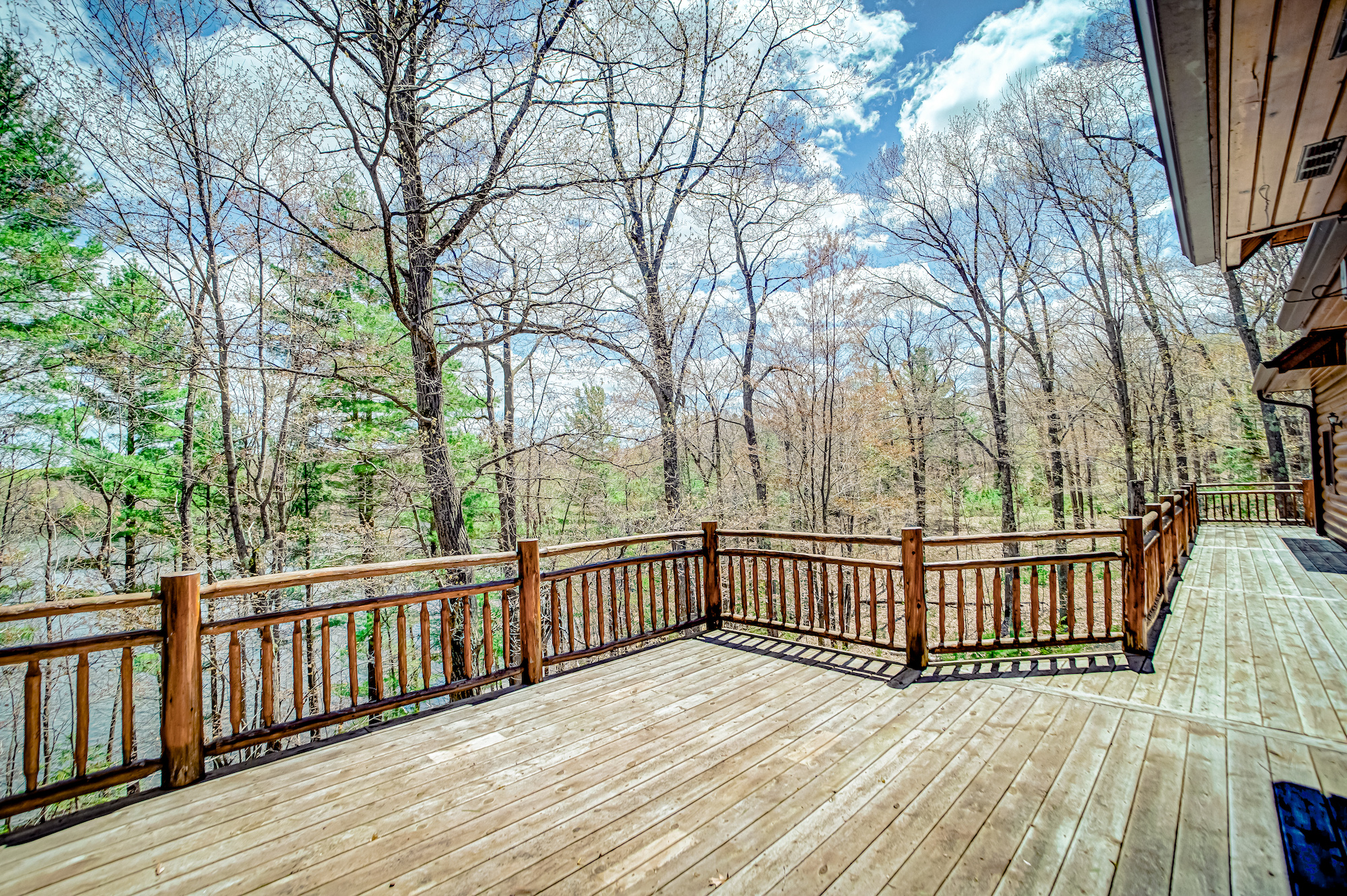 Reconnect with nature in this Storybook Strongwood Log and Timber Home with awe-inspiring scenery with 162 feet of waterfront property on clear and clean Upper Eau Claire Lake in Barnes, Wisconsin.