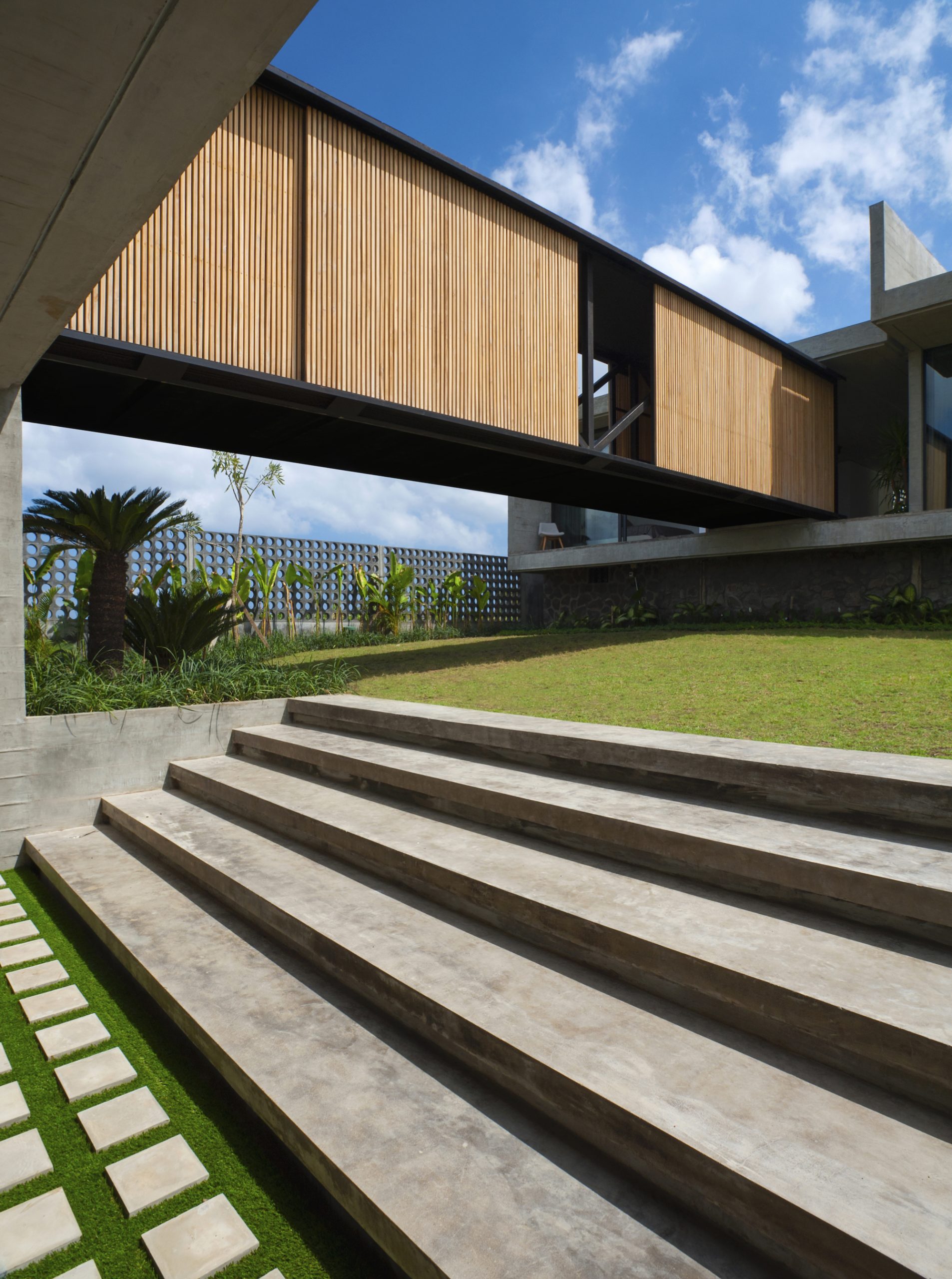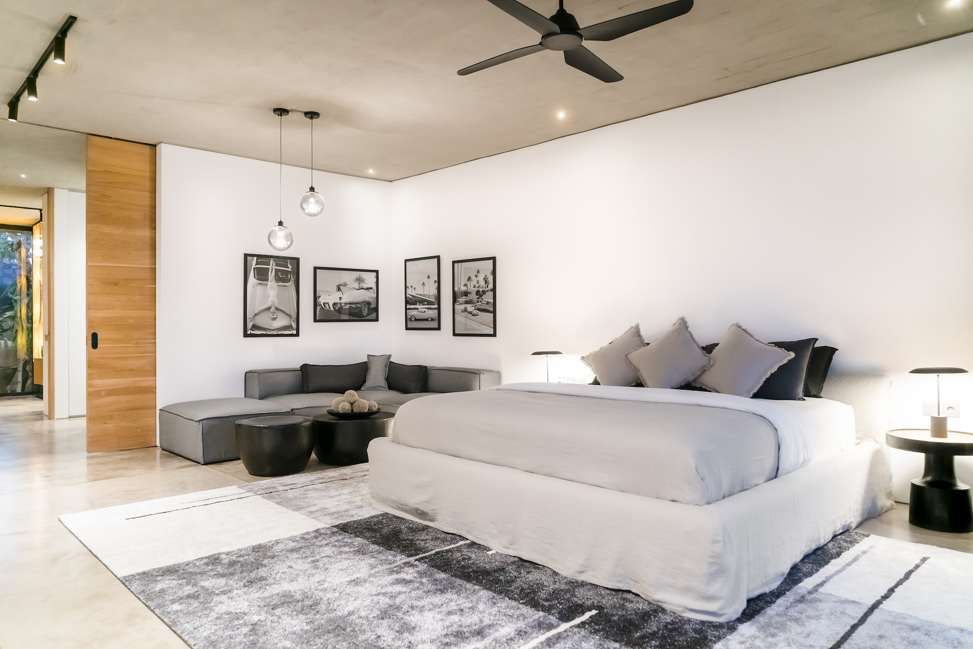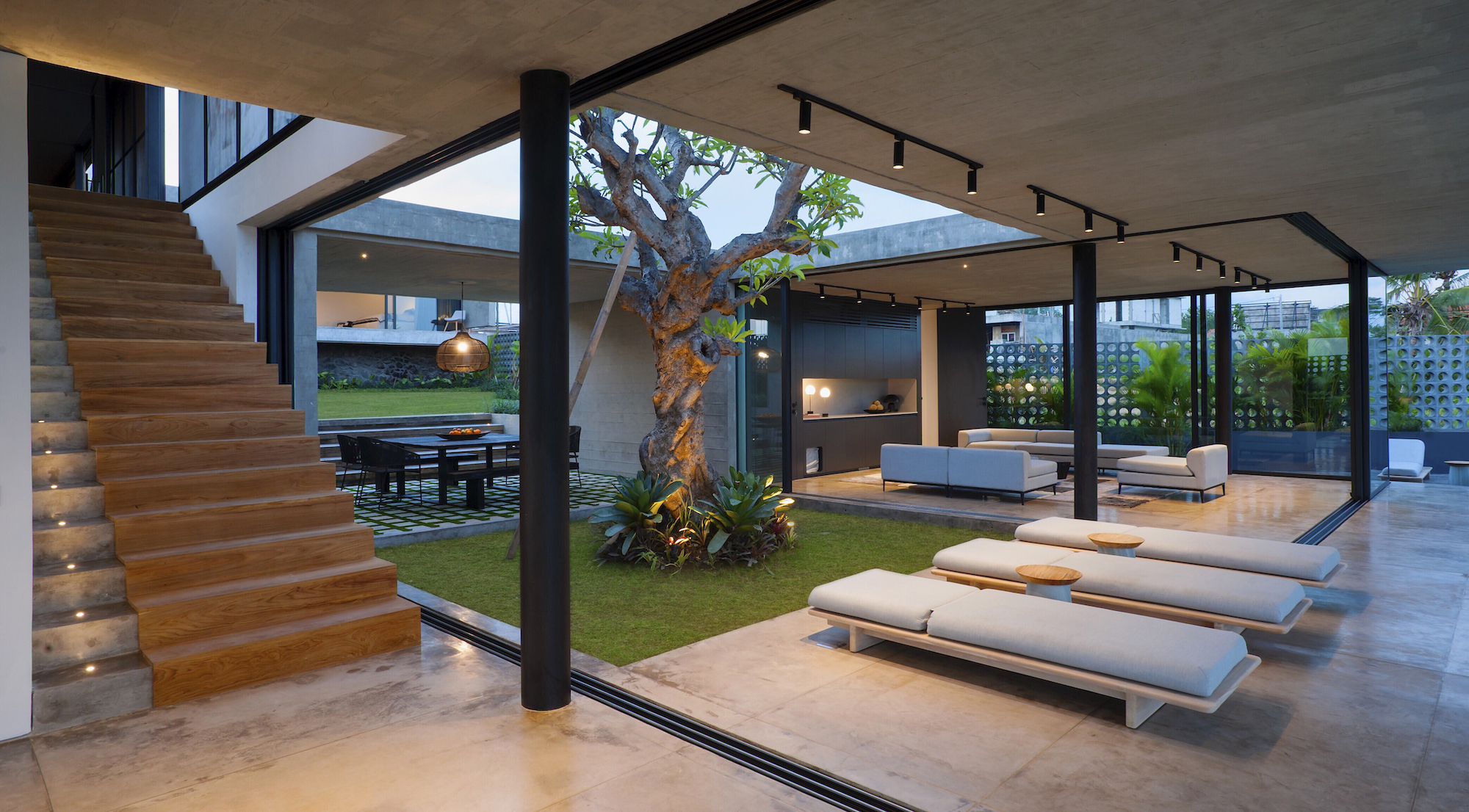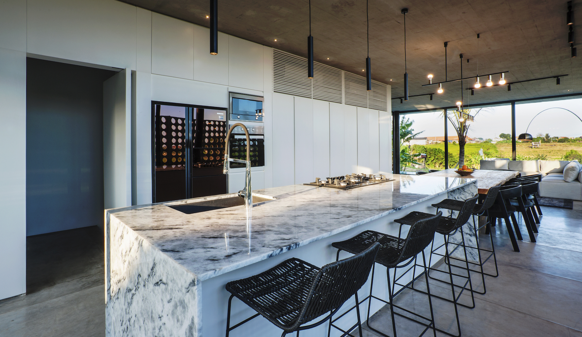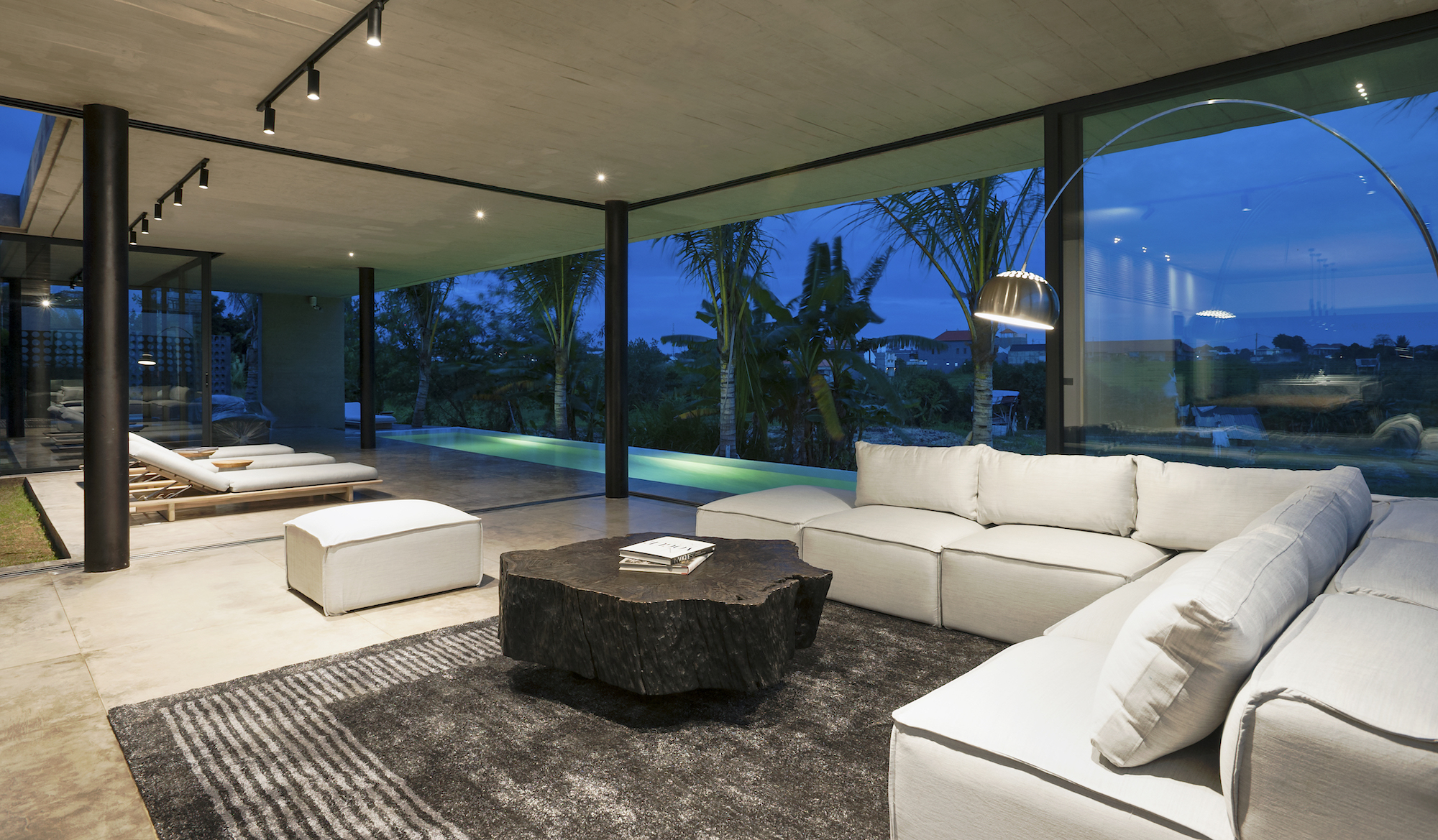 The combination of exposed textured concrete ceilings and walls, polished cement floors, and imported Italian floor-to-ceiling aluminum glass sliding doors make the villa a tropical modern masterpiece.
