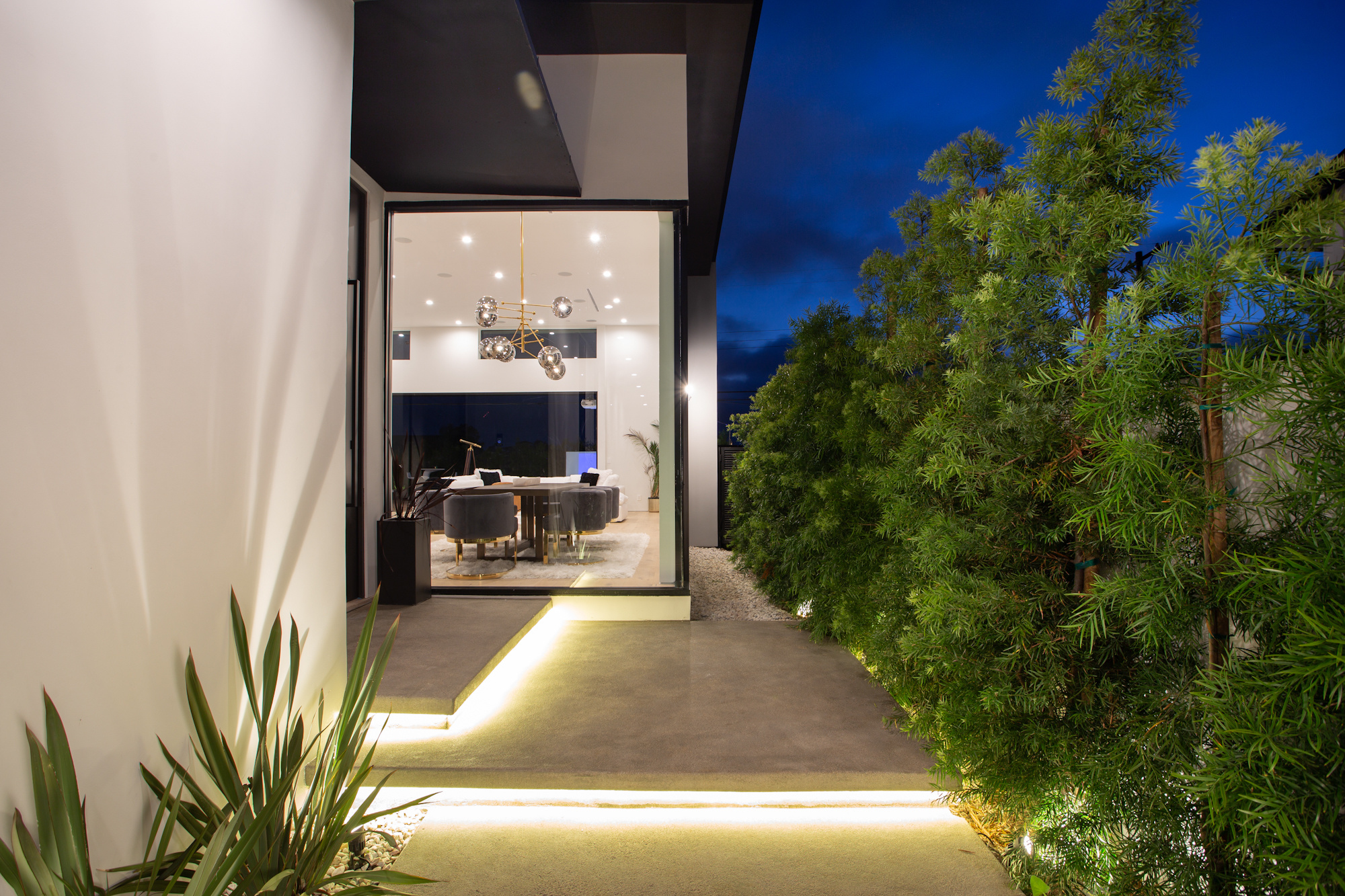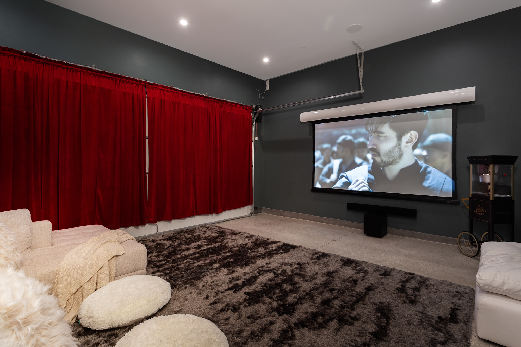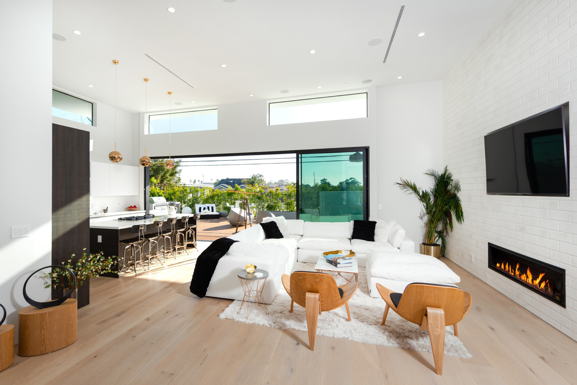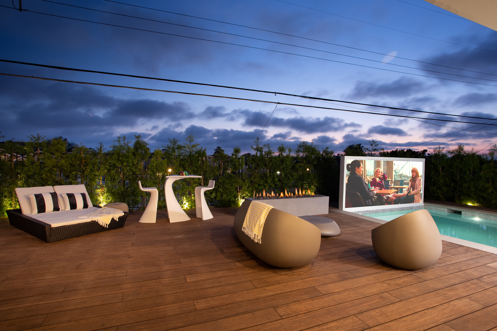 Pull open the floor to ceiling windows to marry inside and out, and enjoy your backyard complete with fire pit, pool, spa, massage waterfall, outdoor movie system and surround sound. Lounge in the pool while enjoying your favorite film for backyard movie nights.