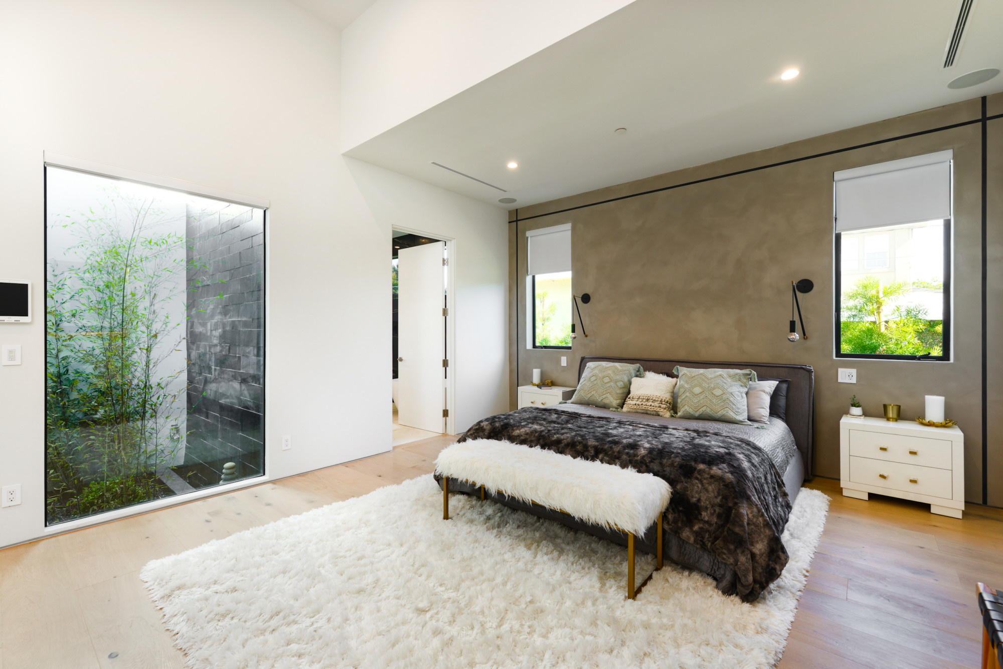 The master suite shines with a fully built out walk-in closet, and luxury bathroom finished with Italian plaster, soaking tub, and rain shower — the ultimate retreat from the hustle and bustle of Silicon Beach.