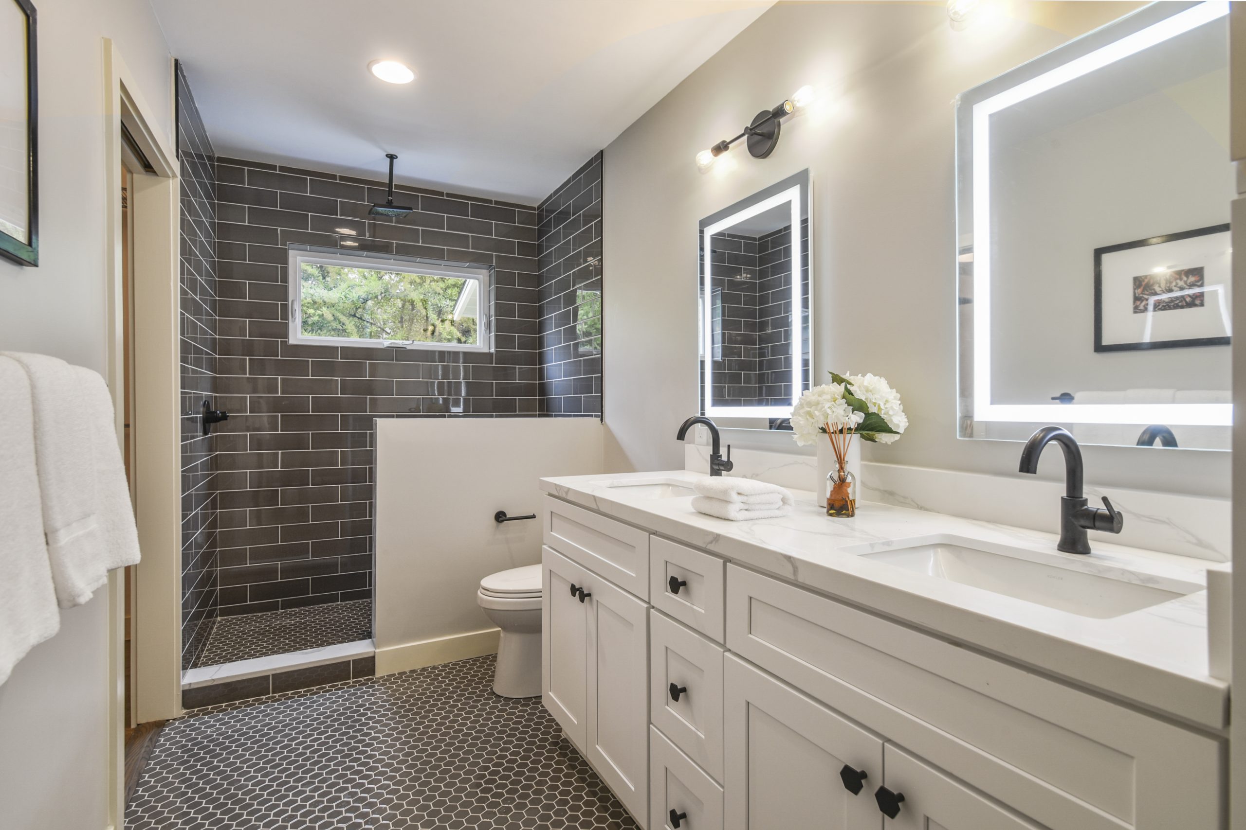 There are two updated bathrooms done in a modern style.