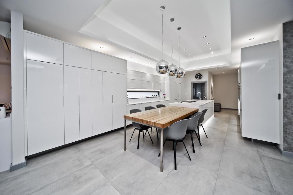 The modern kitchen has Caesarstone countertops and Smeg appliances with an integrated fridge and freezer.