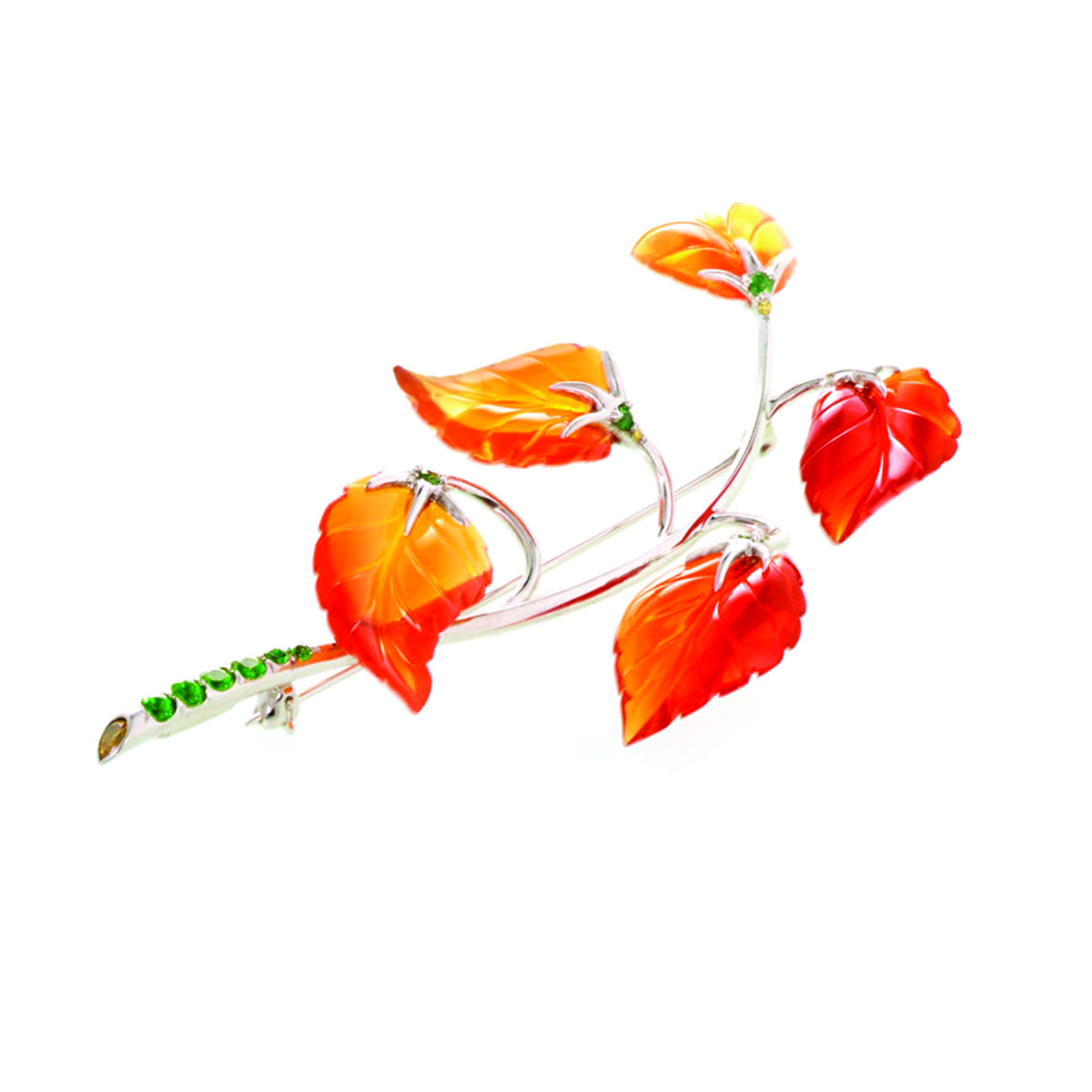 Green stones are also fantastic accents. This elaborate pin/pendant gleams with five carved Mexican fire opals highlighted by four demantoid garnets and four round tsavorites (another form of green garnet). The piece is finished with a pear-shaped yellow diamond and five round fancy yellow diamonds set in platinum. ($15,000).
