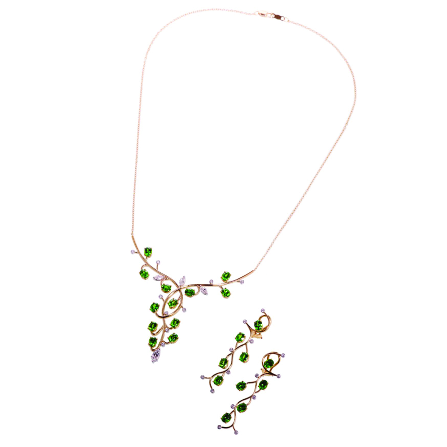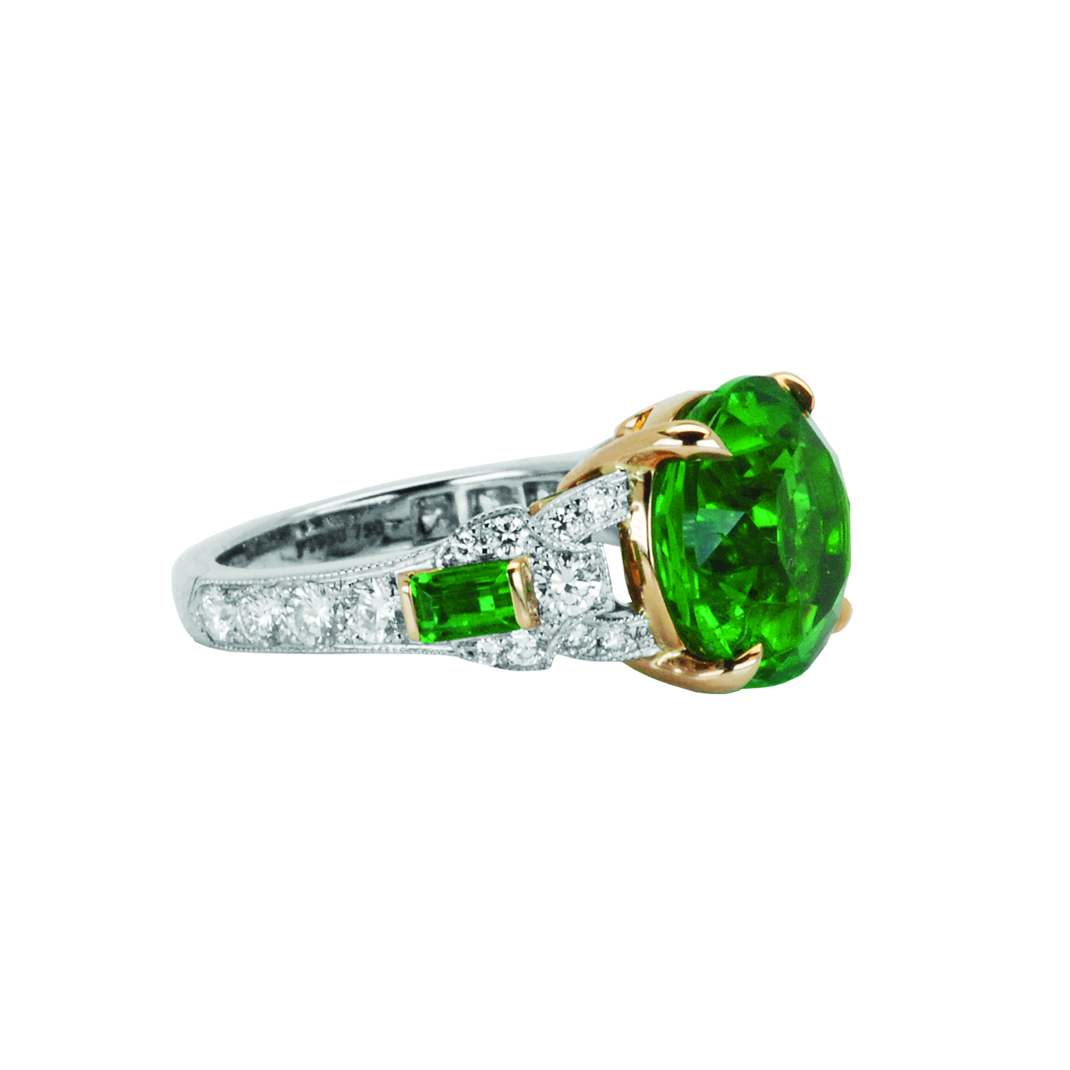 Emeralds are far from the only green stones. Demantoid garnets may lack the name cachet of emeralds but they deliver when it comes to fire and true green color. This Russian demantoid garnet and diamond necklace and earring set is designed with sinuous forms that mimic the effect of curving vines, showcasing the wearer in a dramatic way. The necklace has 12 oval Russian demantoids (5.08 cts.), 4 marquise diamonds (0.75 cts.), and 9 round diamonds (0.10 cts.), set in gold and platinum.( $27,000.00). The earrings have 10 oval Russian demantoid garnets (4.14 cts.) and 14 round diamonds (0.16 cts.), set in gold and platinum. ($26,000.00).
